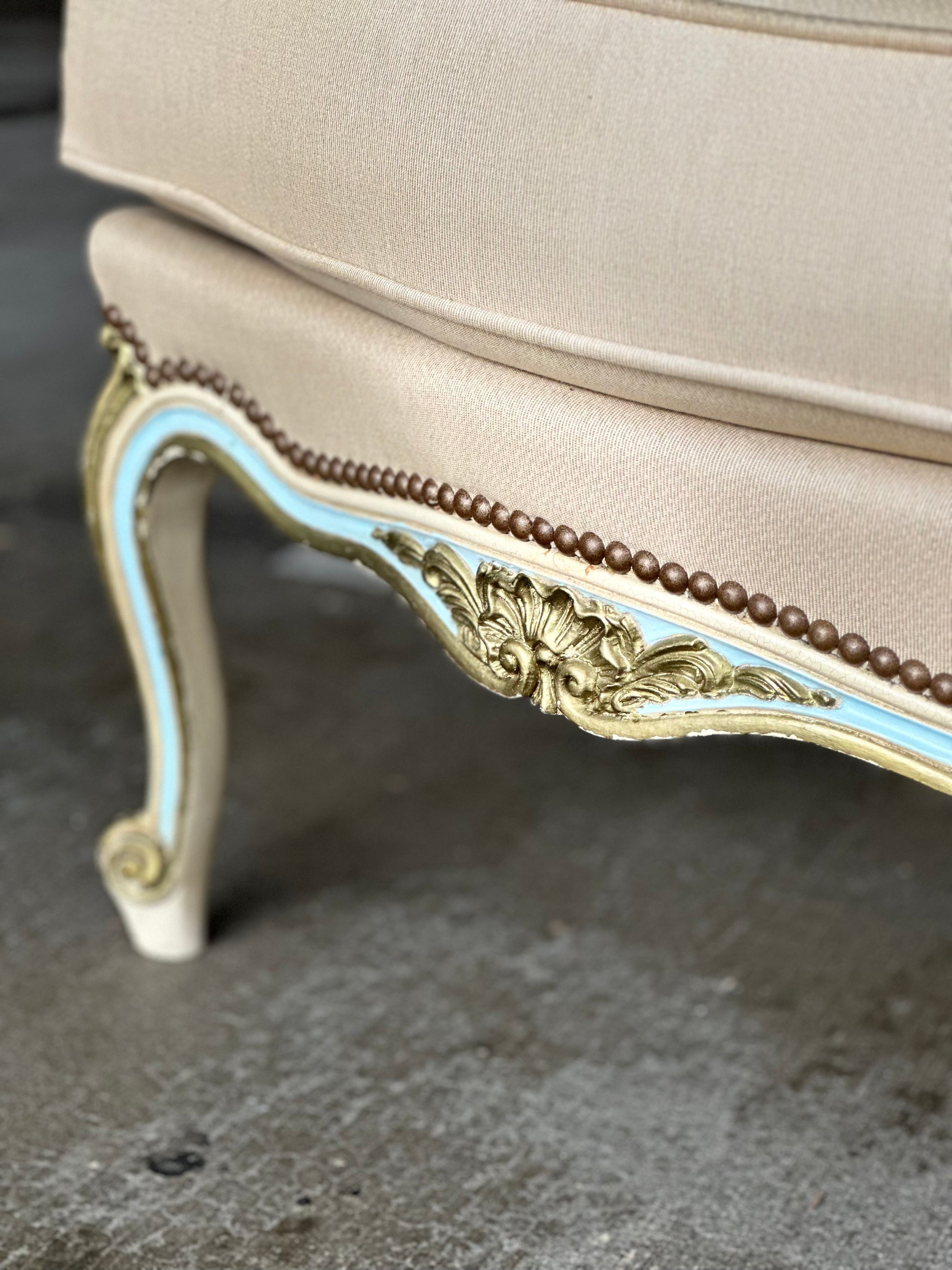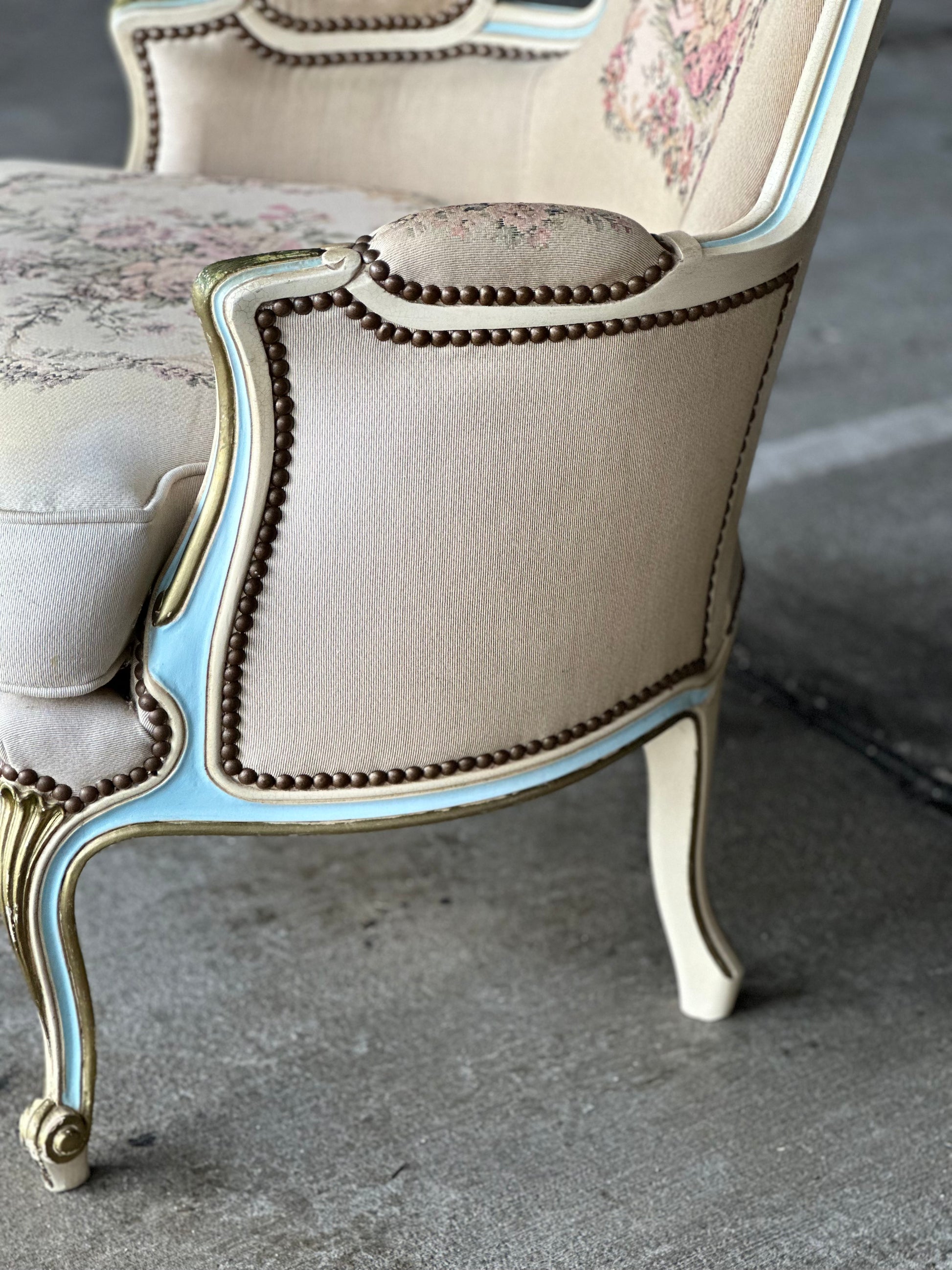 Na pierwszy ogień leci ten cudny fotel w stylu ludwikowskim, który został pomalowany w odcień jasnego beżu z dodatkiem błękitu. Jest bardzo zadbany, stabilny oraz przede bardzo wszystkim wygodny.