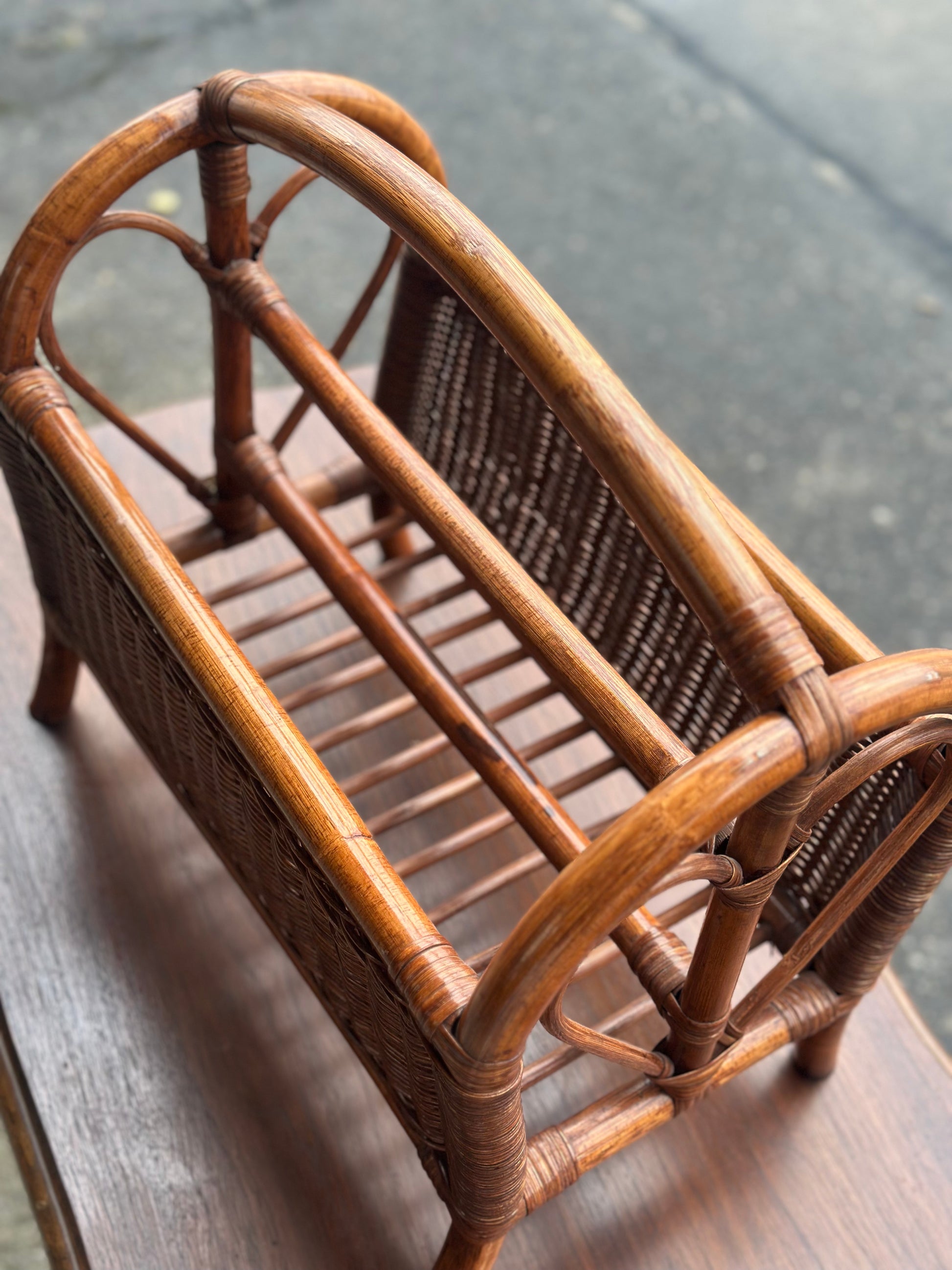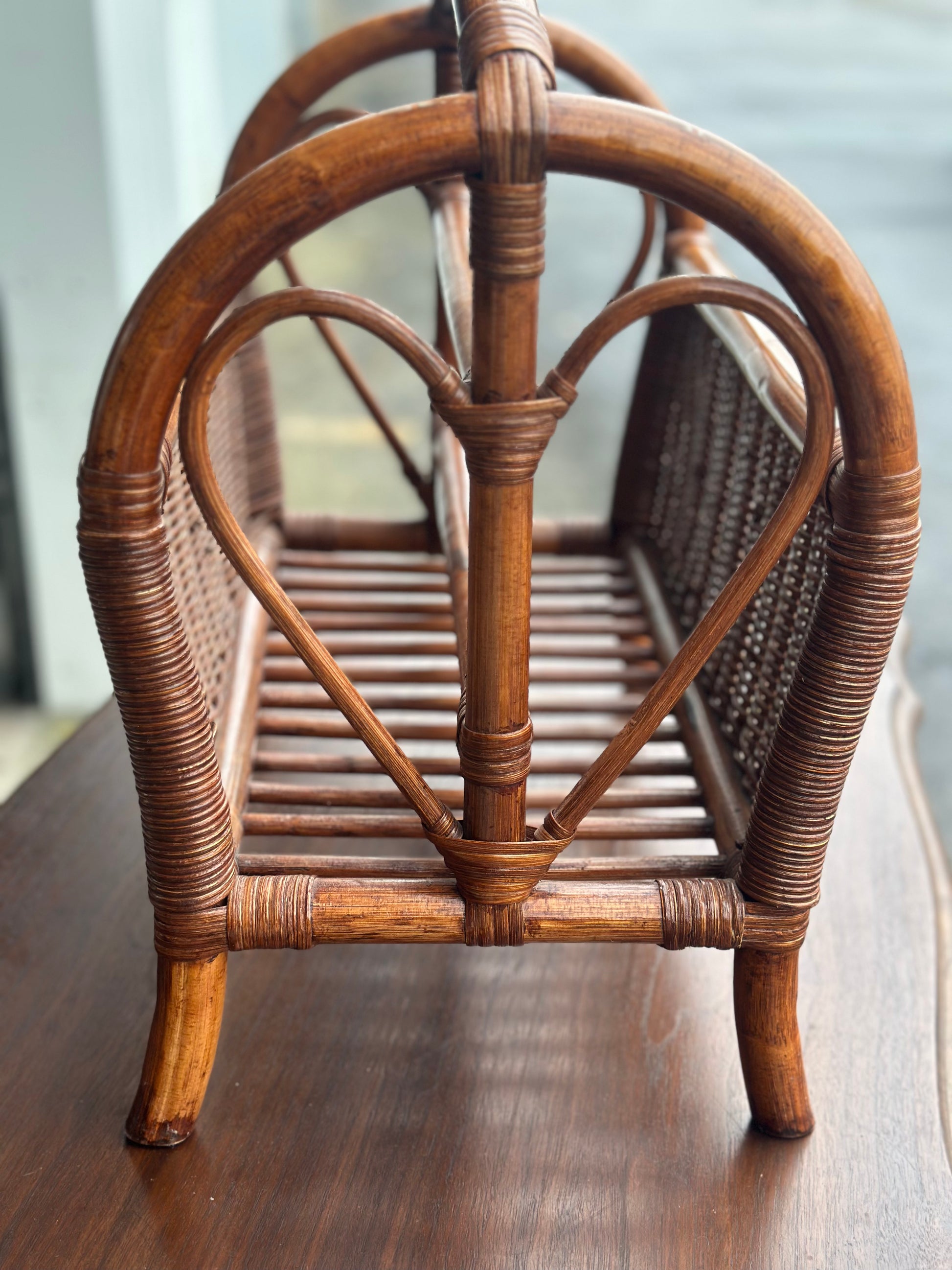 Uroczy i bardzo stylowy kosz na gazety, wykonany z ciepło wybarwionego rattanu (lub wikliny). Ma klasyczny, zaokrąglony kształt z praktycznym uchwytem i plecionymi bocznymi ściankami. Tego typu przedmioty były niezwykle popularne na Francuskiej Riwierze w latach 60. i 70. (styl "Cannes"). Jest lekki, elegancki i idealnie pasuje do wnętrz w klimacie boho, retro, a nawet kolonialnym, dodając im swobodnego, wakacyjnego charakteru.