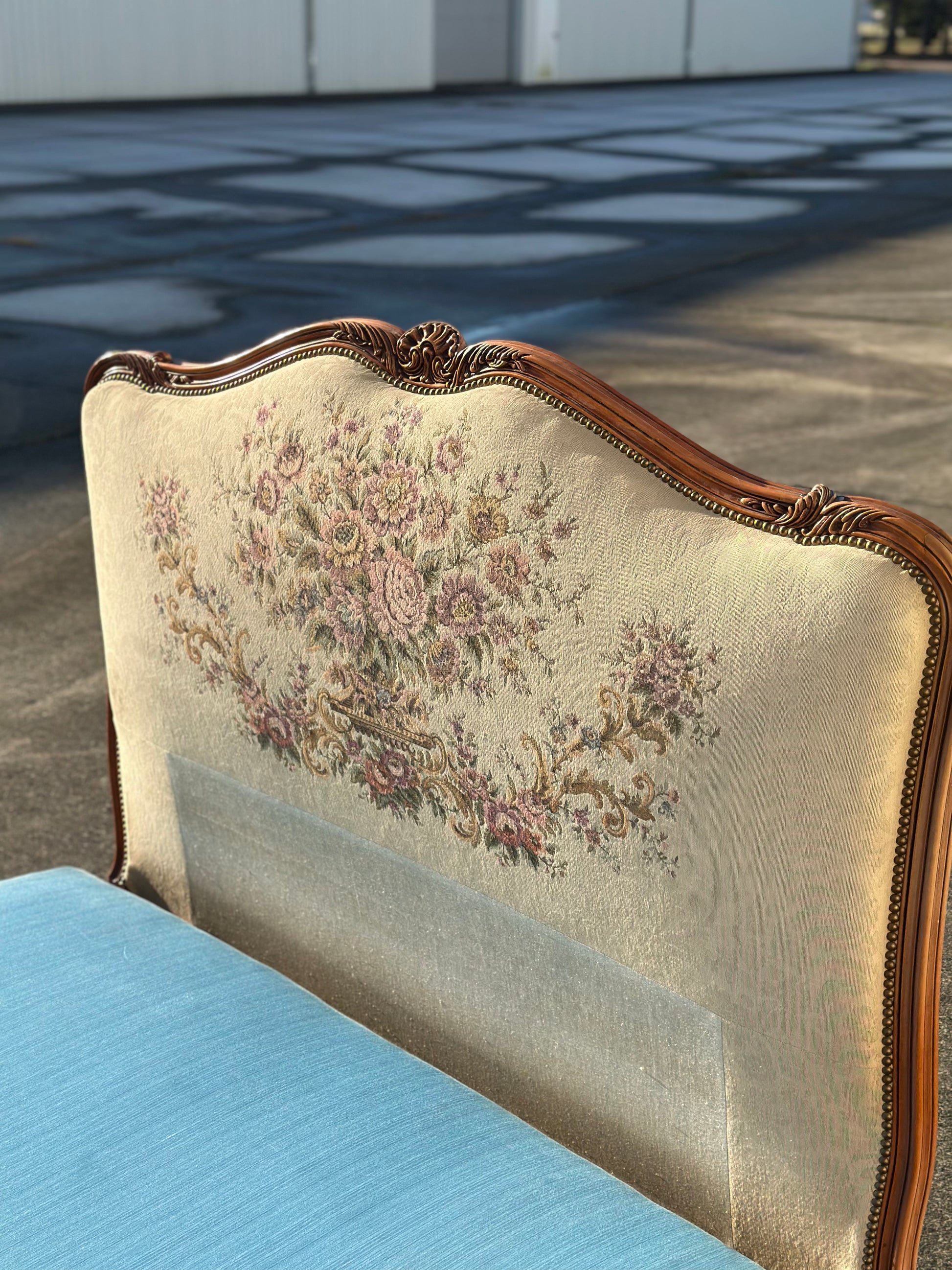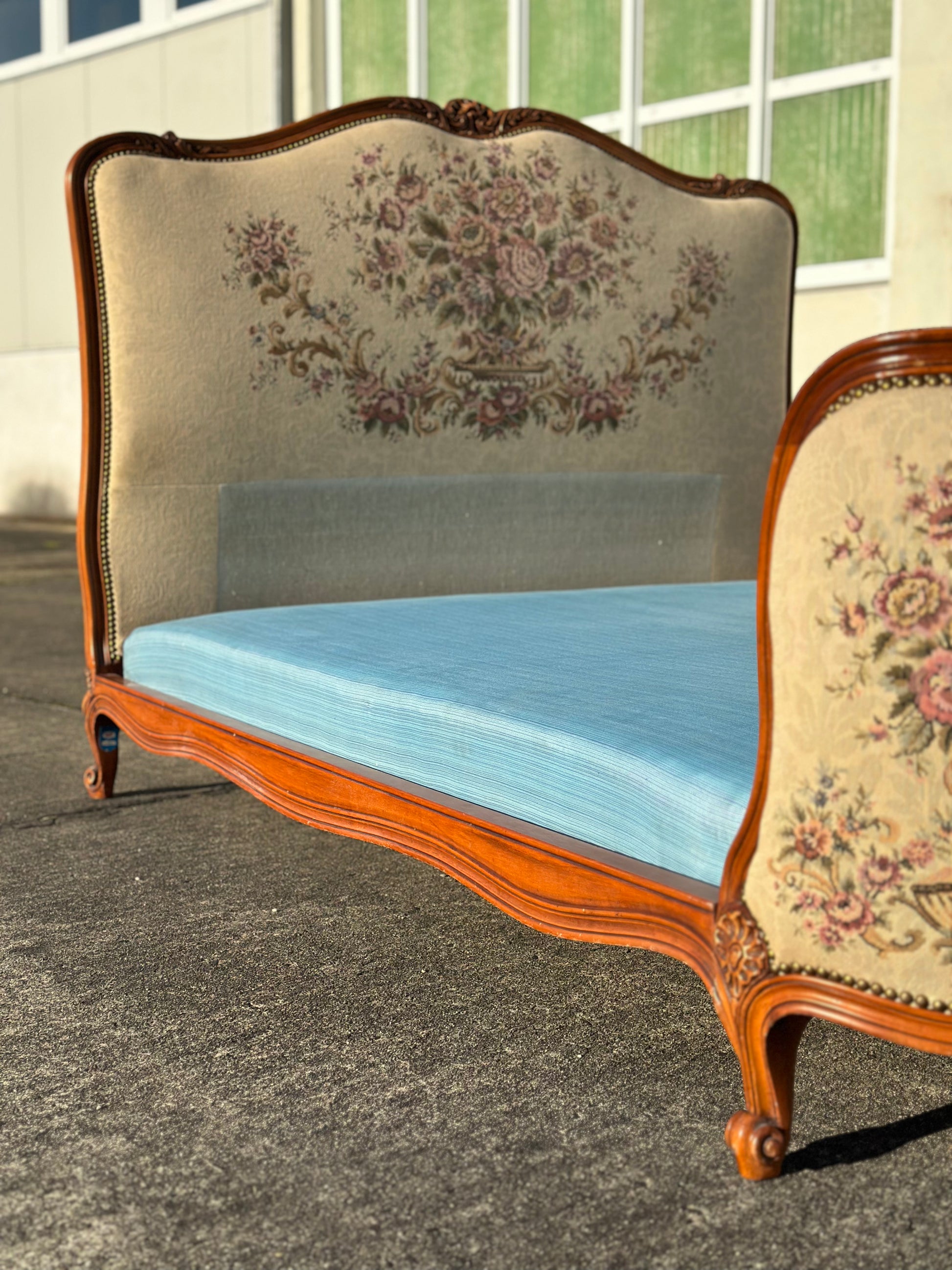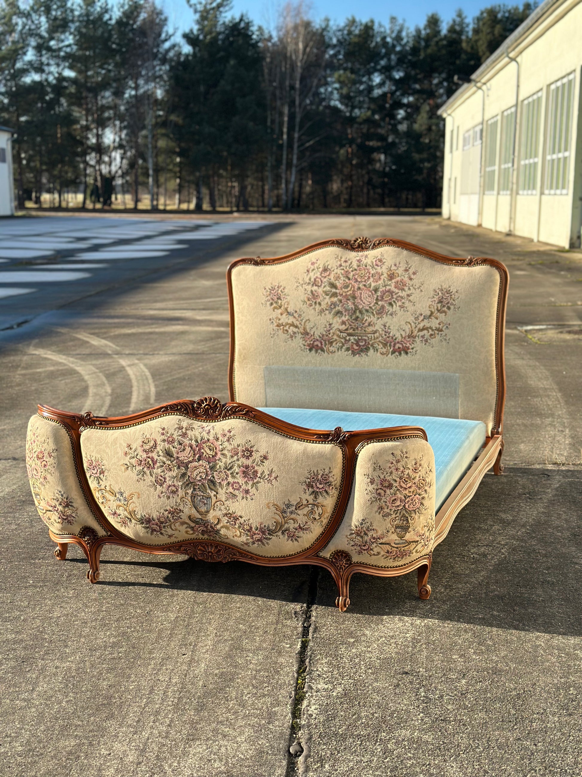 Cudne łóżko w stylu ludwikowskim, które wygląda jak wyjęte prosto z bajki🤗 Cudne, z pięknymi rzeźbieniami i tapicerką w kwiatowy wzór.