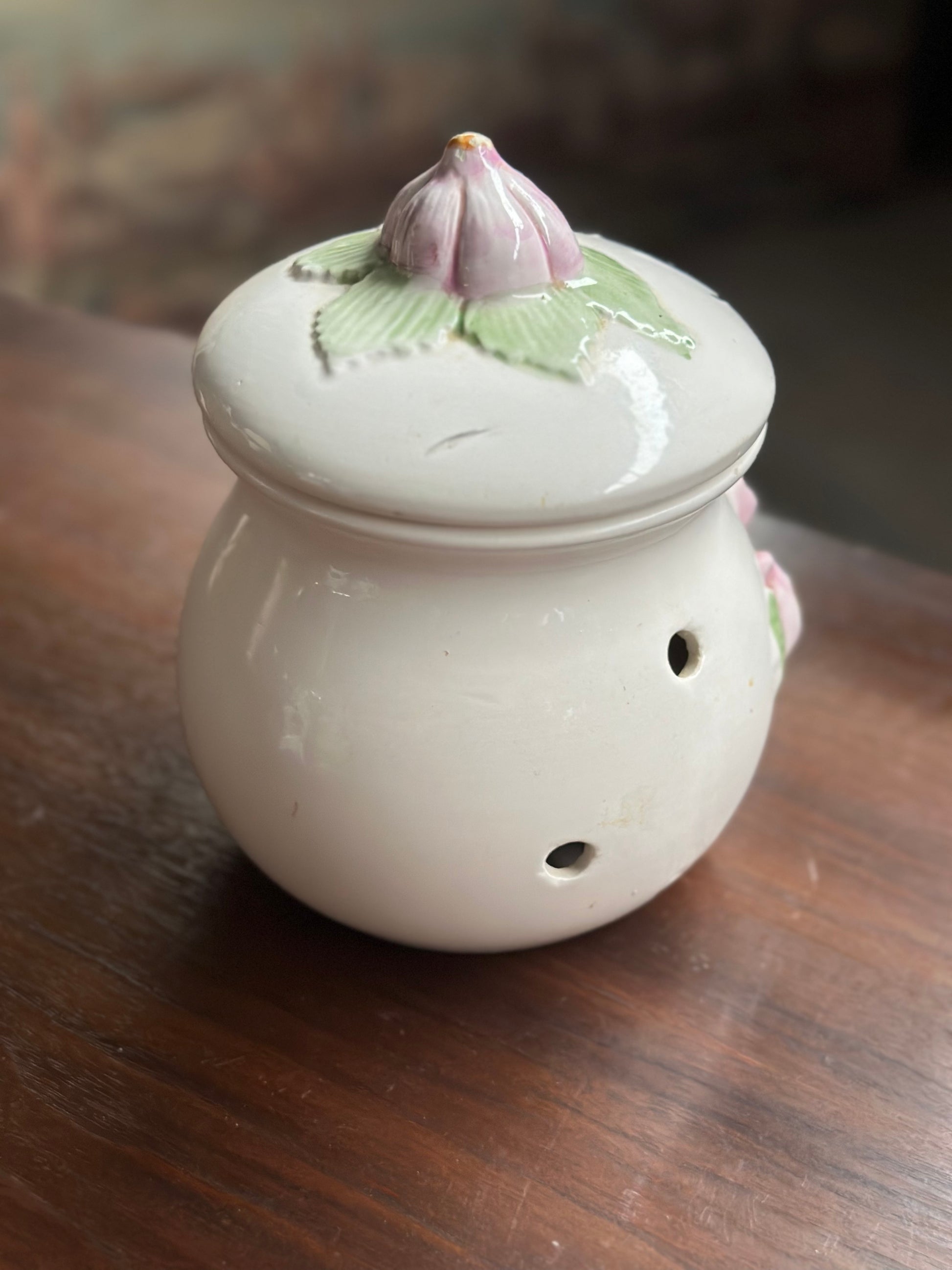 Uroczy kuchenny pojemnik vintage na czosnek (Ail), przywieziony prosto z Francji. Wykonany z ceramiki, zdobiony reliefami i malunkami cebulek czosnku, z pokrywką w kształcie główki. Idealny dla miłośników gotowania i francuskiego stylu country w kuchni. To nie tylko praktyczny, ale i kolekcjonerski dodatek, który wprowadzi sielski, vintage klimat.