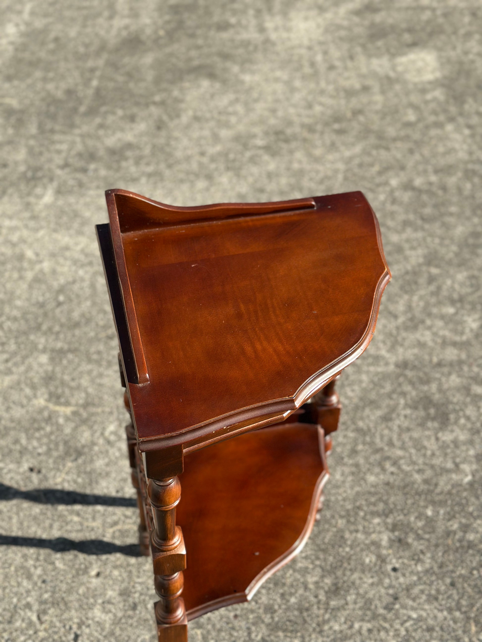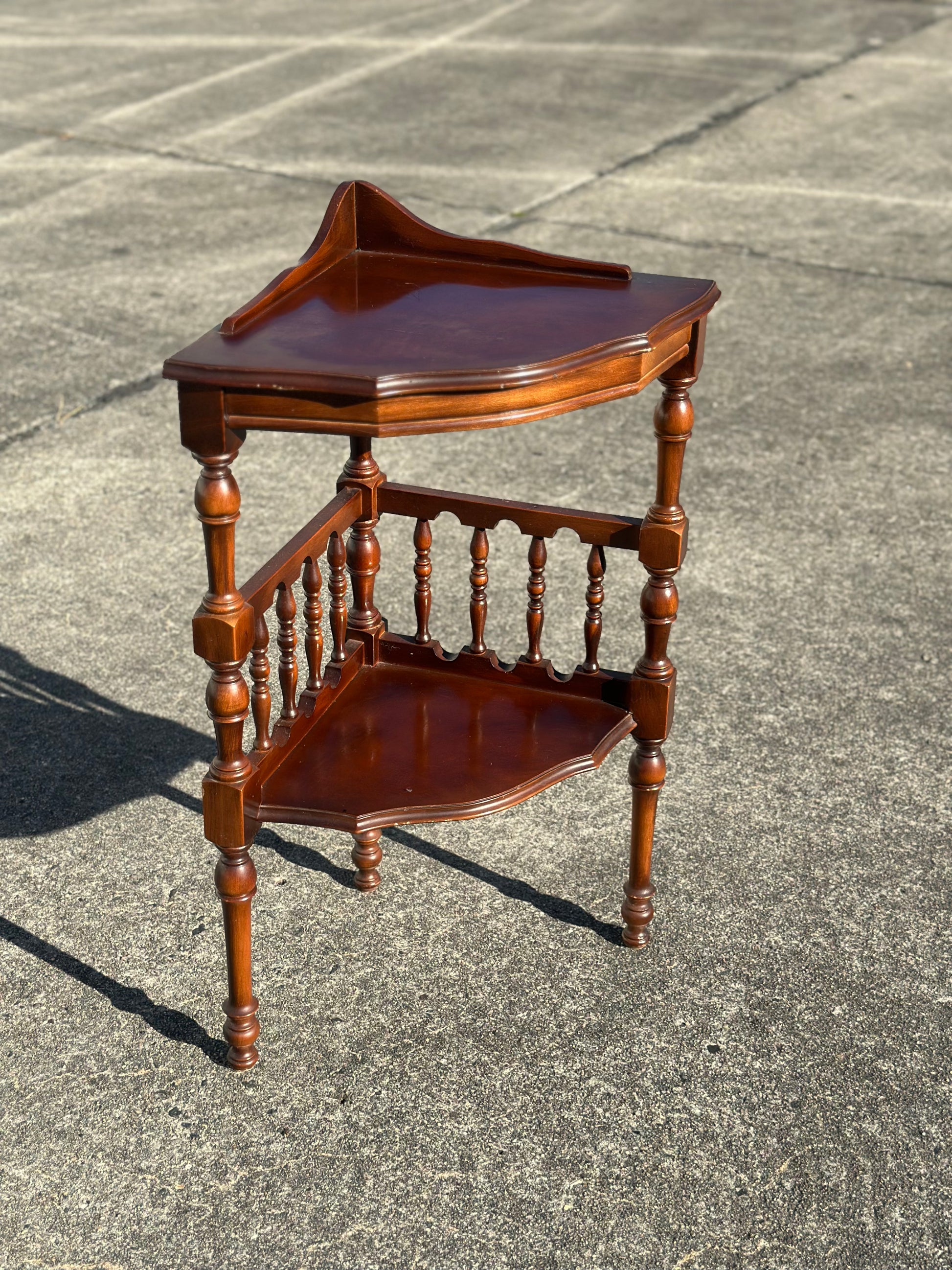 Przedstawiamy Wam wyjątkowy, narożny stolik, który świetnie wykorzysta każdy kąt pokoju. Ten mebel w stylu Wiktoriańskim to prawdziwa klasyka z dawnych lat, która dodaje ciepła i elegancji. Ma dwie półki, idealne na Wasze ulubione kwiaty, książki lub pamiątki. Nóżki i barierki są pięknie toczone, co jest znakiem dobrego rzemiosła. Ciemne, lśniące drewno sprawia, że stolik wygląda bardzo stylowo i pasuje do wielu wnętrz. To idealny sposób, aby w łatwy sposób upiększyć Wasz salon lub jadalnię!