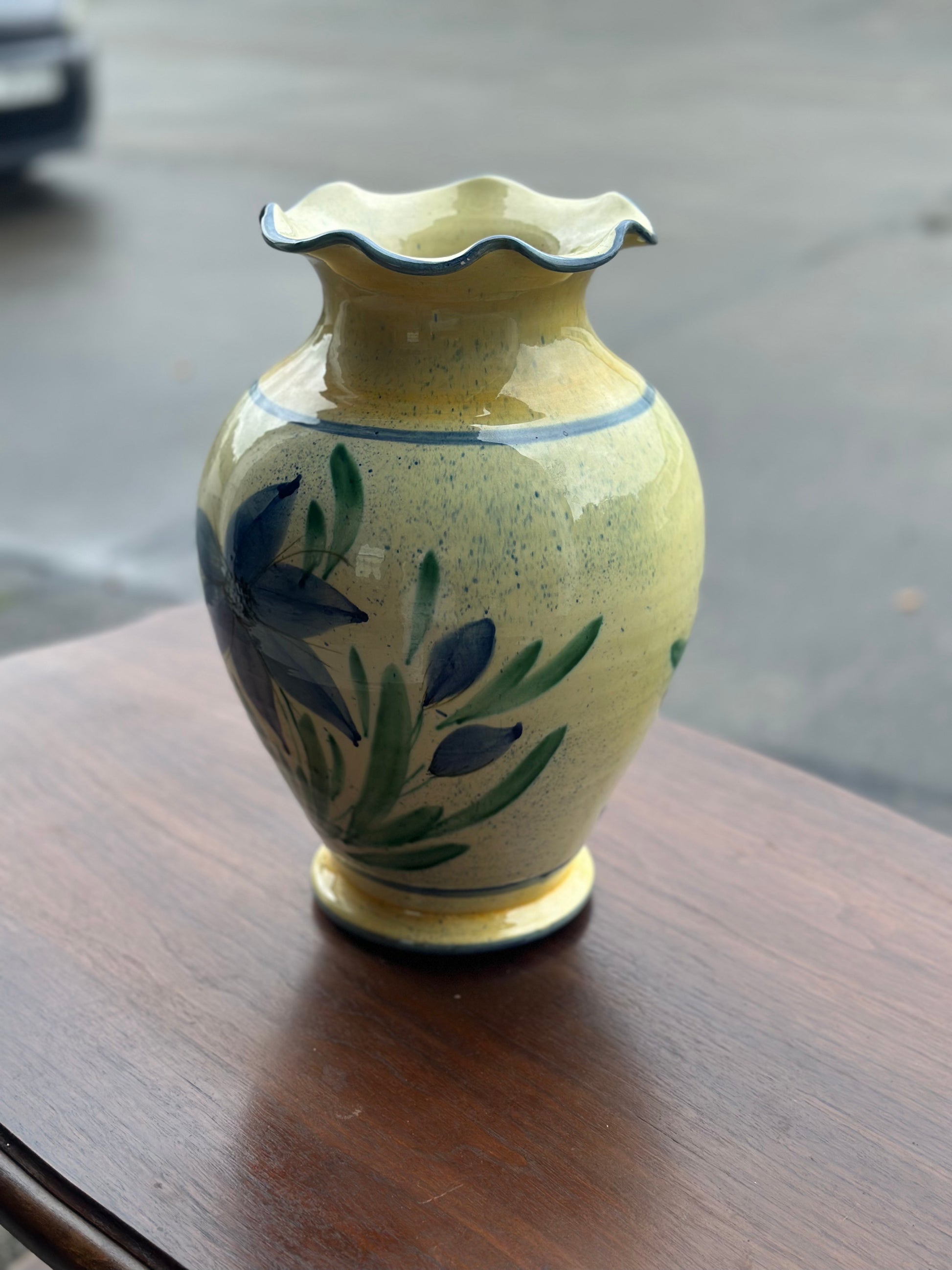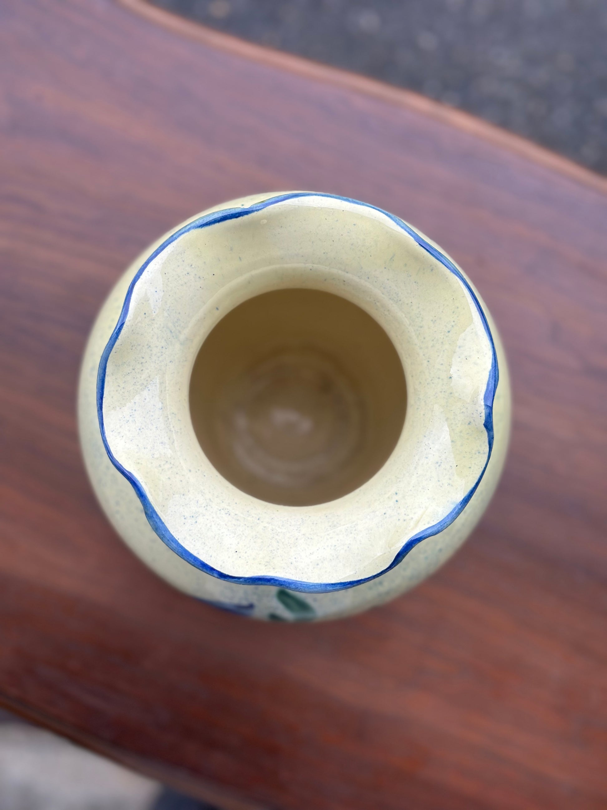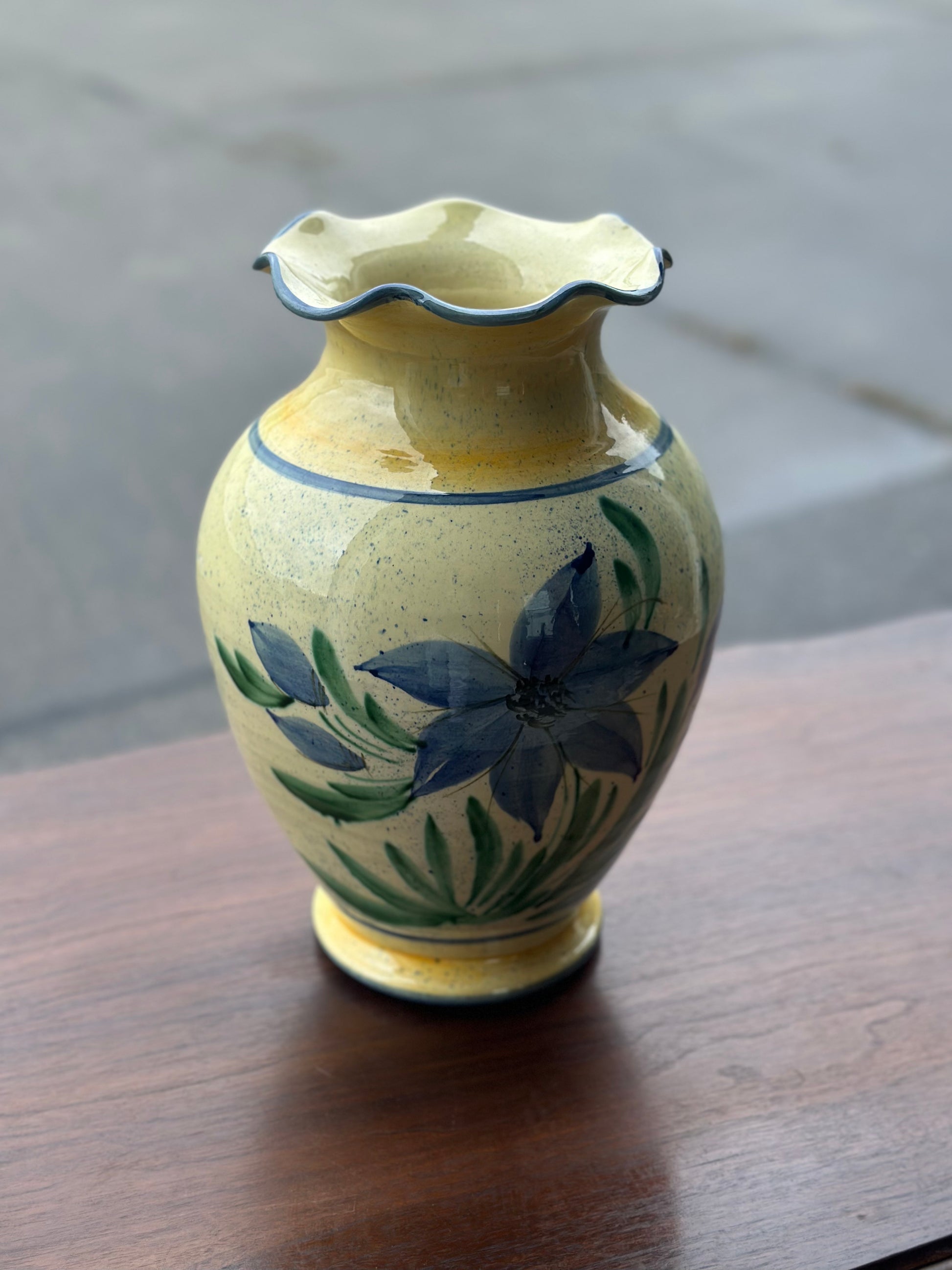 Uroczy, ceramiczny wazon o pękatym korpusie i fantazyjnie pofalowanym kołnierzu, który przypomina falbankę. Ma piękny, maślano-żółty kolor i jest ręcznie ozdobiony dużymi, błękitnymi kwiatami i zielonymi liśćmi, co nadaje mu lekkości i bardzo radosnego charakteru. Ten wazon idealnie sprawdzi się jako wesoły dodatek w każdym wnętrzu w stylu wiejskim lub vintage.