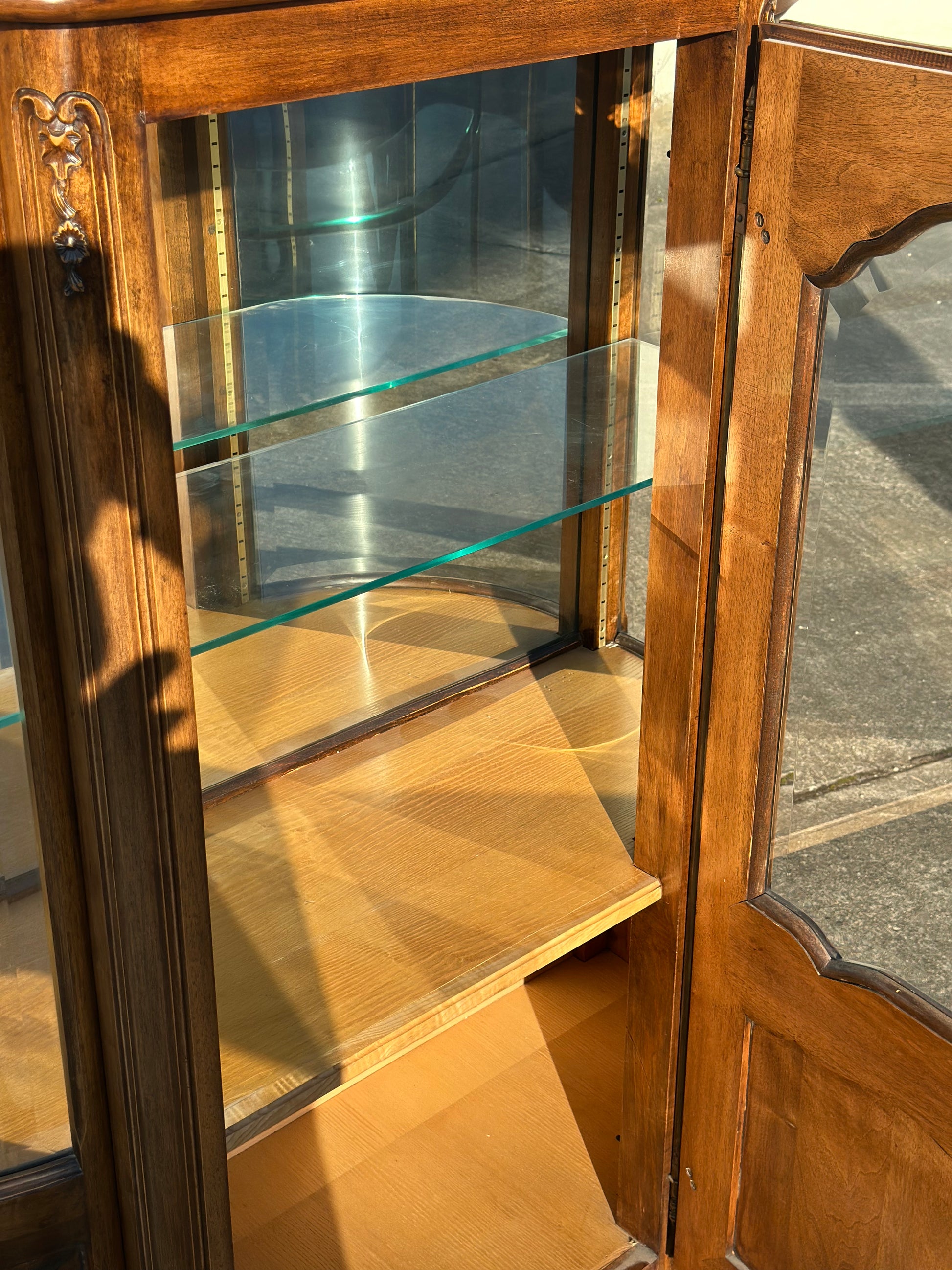 Witryna wykonana jest z litego drewna orzechowego, posiada jedną półkę ze szkła hartowanego, przez co utrzyma naprawdę spory ciężar książek, porcelany, czy innych dekoracji ❤️