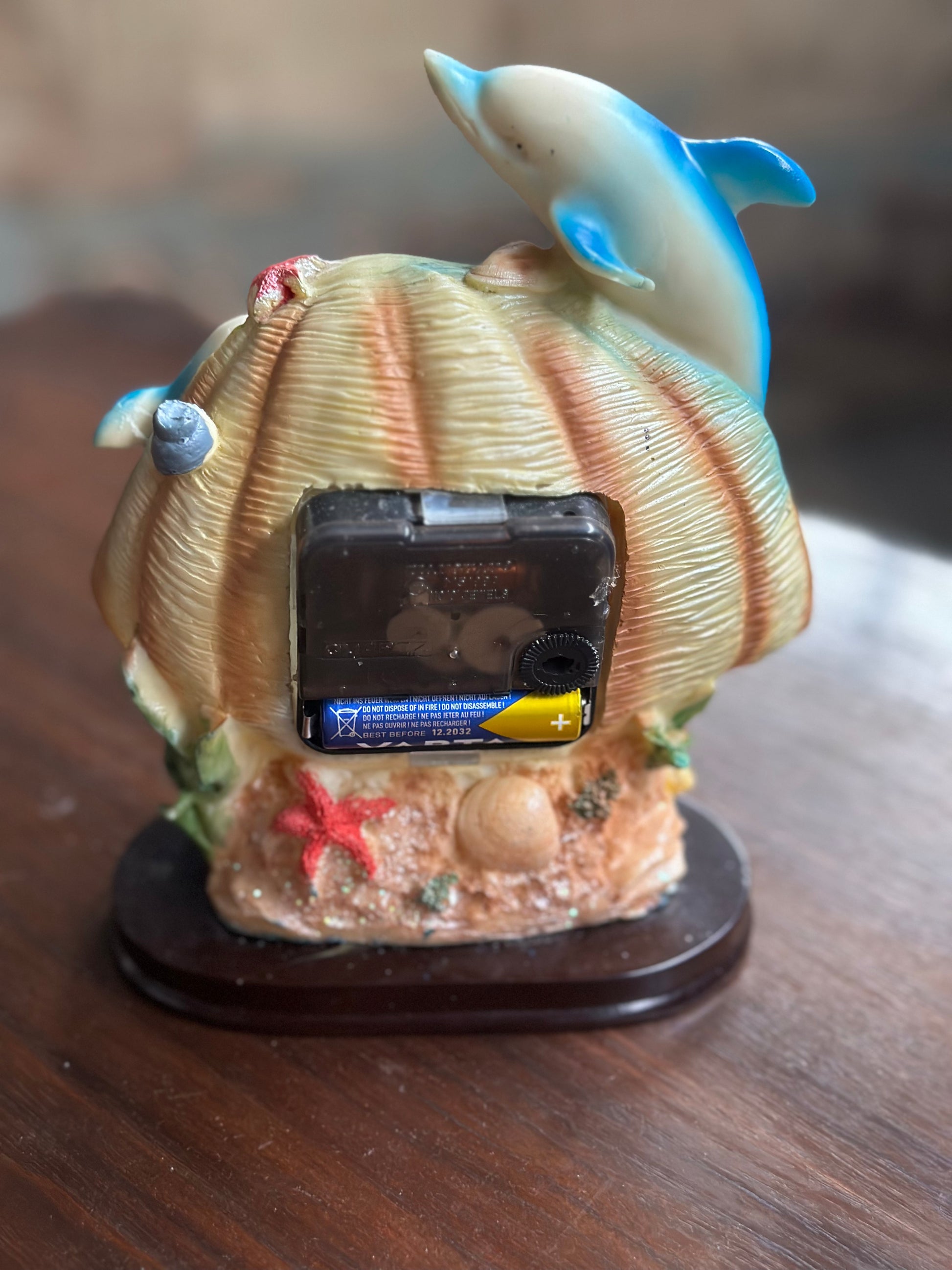 Uroczy zegar stołowy vintage z dynamiczną sceną oceaniczną, przywieziony prosto z Francji. Ta kolekcjonerska figurka przedstawia dwa delfiny wyskakujące z fal, otoczone barwnymi koralowcami i muszlami. Jest to idealny akcent dekoracyjny do pokoju lub łazienki, wnoszący do wnętrza francuski styl vintage i morski klimat. Mechanizm kwarcowy znajduje się z tyłu figurki (zasilanie na baterię).