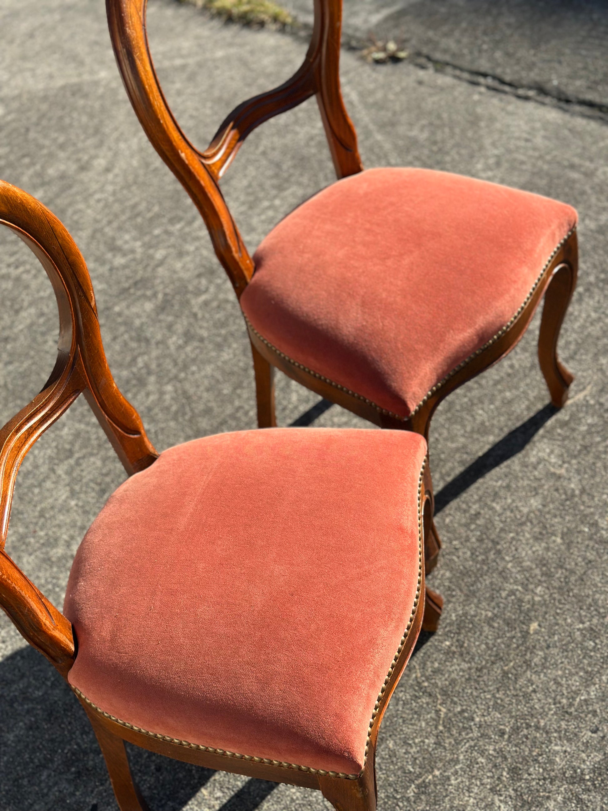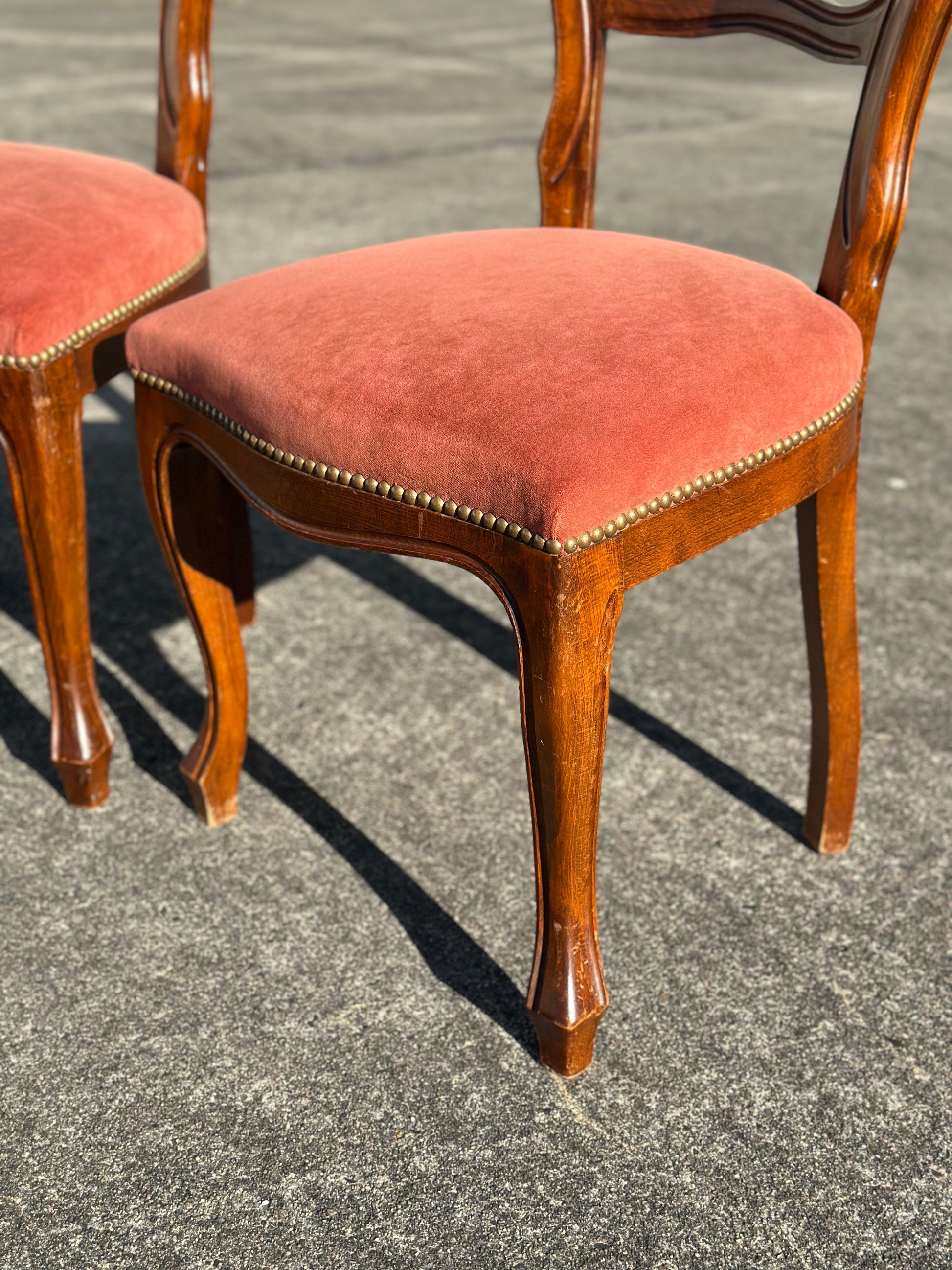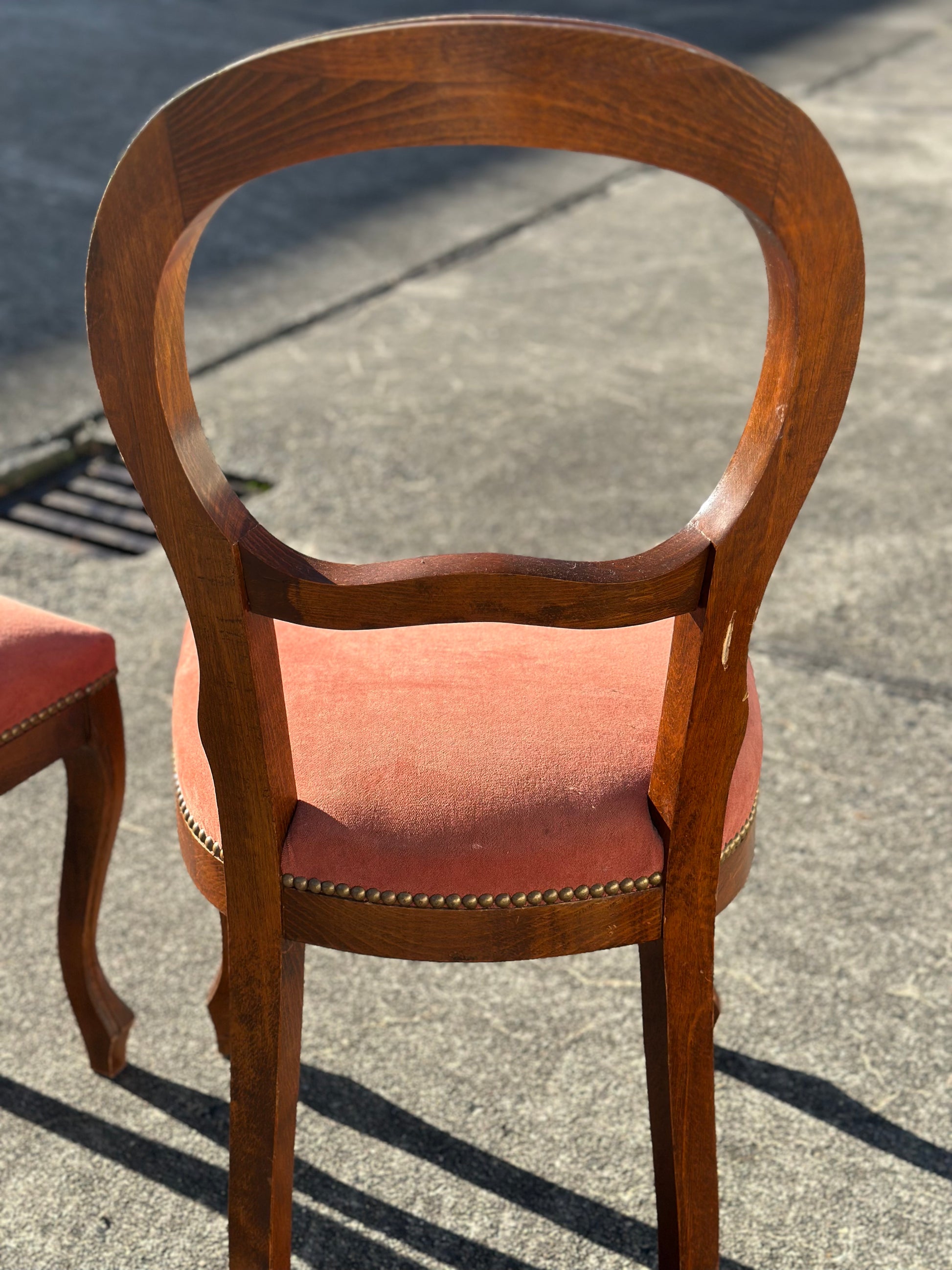 Spójrzcie tylko na te piękne krzesła! To meble w stylu, który wygląda bogato i elegancko, często nazywanym "Ludwikiem" z dawnych lat. Mają ładne, gięte nóżki i okrągłe oparcia, które są bardzo wygodne. Siedziska są obite miłym, miękkim materiałem w kolorze delikatnego różu, co dodaje im ciepła. Te krzesła to prosty sposób, aby Wasz dom wyglądał bardziej elegancko i przytulnie.